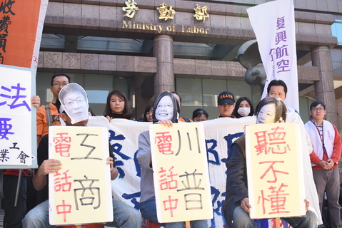 「ㄘㄞˋ的部長,勞工幫補課!」國道收費員自救會、台灣鐵路產業工會、復興航空企業工會15日到勞動部前演出行動劇,要教新任勞動部長林美珠勞權3課:「誠信協商的重要、政府守法的必要、包庇雇主的危險」。針對上述3...