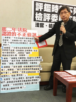 被檢察官要脅只能往肚裡吞?檢察官評鑑委員會(檢評會)2年來只移送3件檢舉案至監察院。司改會董事長林永頌5日表示,檢察官身分有別於一般公務員,特別立法偵查終結後民眾有2年時間檢舉,但現實運用民眾往往遭檢評會...