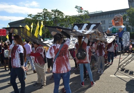移工穿著血衣大遊行!菲律賓、印尼、越南、泰國等外籍看護工13日穿著血色上衣踩街,用中文高喊,「反對血汗長照,給我照顧正義!」各移工團體也前往蔡英文競選總部,遞交「您的一哩與我們的九十九哩」公開信,盼正在邁...