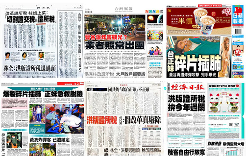 泰國四面佛發生爆炸案,國內旅遊業泰國曼谷照常出團成為《台灣醒報》19日頭版頭條,報導指出,雄獅、東南、五福、燦星和鳳凰等大型旅遊公司都表示,爆炸案完全不影響近期出團,只有外交部對當地的旅遊警示升至「紅色」...