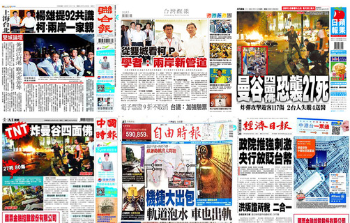 泰國首都曼谷市中心著名的四面佛壇17日發生炸彈爆炸案,造成多人死傷成為《中國時報》、《蘋果日報》18日頭版頭條。另外,《台灣醒報》和《聯合報》頭版頭條則關注柯文哲赴上海參加雙城論壇,醒報報導指出,文化大學...
