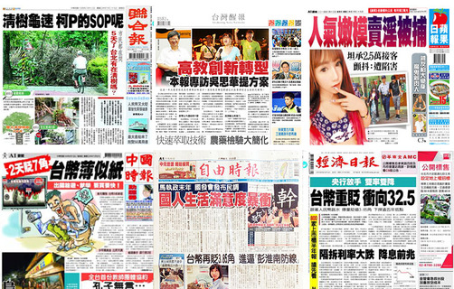 高教創新轉型,教育部部長吳思華提方案成為《台灣醒報》13日頭版頭條,吳思華接受醒報專訪時表示,高等教育轉型關鍵在激發學校自主創新的動機。另外,台幣連2天大跌,創5年來新低成為《中國時報》、《經濟日報》頭版...