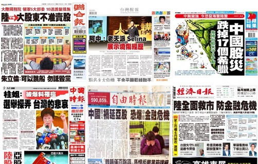 中國股市遭逢23年來最嚴重股災,若中股跌勢不止,恐引發中國版「金融危機」 成為《自由時報》、《蘋果日報》、《聯合報》、《經濟日報》9日頭版頭條。另外,藝人Selina的丈夫「阿中」分享和Selina在燒傷...