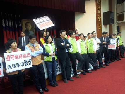 早料到!服貿第一天審查未果。立法院內政委員會12日預定審查服貿協議,由8個委員會的立委聯席審查。由於民進黨前一晚就夜宿主席,提早簽到發言人順序台,被國民黨認為違反議事程序。到了下午朝野立委仍因發言程序問題...