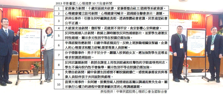 全國671名諮商心理師票選去年影響國人心理健康的重大新聞,包括仲丘案、大埔案、食安風波都擠進前10。這次選出2013年涵蓋職場、感情、家庭、性別及社會正義等面向的10大事件,認為民眾普遍對生活環境失去安全...