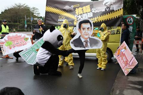 警報聲響起,身穿輻射防護衣的核輻怪獸步步逼近,所有人頓時陷入恐慌。總統馬英九、熊貓圓仔雖然也拚命逃跑,卻不敵無遠弗屆的核輻射,雙雙身亡。16日反核團體聚集在凱達格蘭大道,以行動劇「核輻飛揚,萬物俱亡」預演...