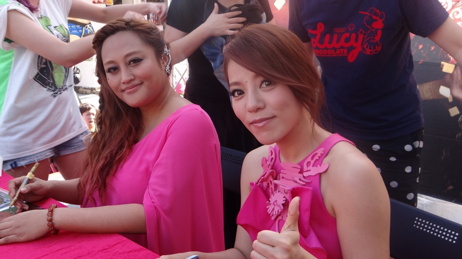 叮噹、家家兩人一身桃紅色洋裝出席《蘭陵王》原聲帶慶功簽唱會,替戲迷在原聲帶上簽名。(photo by 劉家安/台灣醒報)