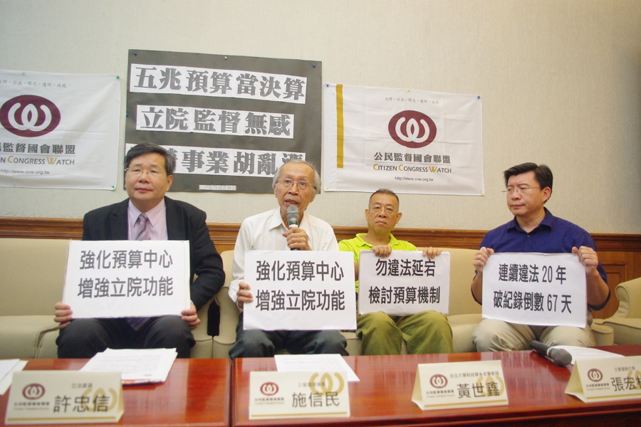公督盟理事長施信民指出,根據預算法第51條,新年度的預算案需在11月30日前審議通過。然而高達數兆的預算卻連續20年違法延宕,從短短僅一個月到近十年長至6個月,去年更延宕了整整一年。如今已到10月,102年的國營事業預算卻尚未審議通過,依照去年在12月14日才審議通過的情況看起來,顯然將預算當決算,立法院的監督機制形同虛設。