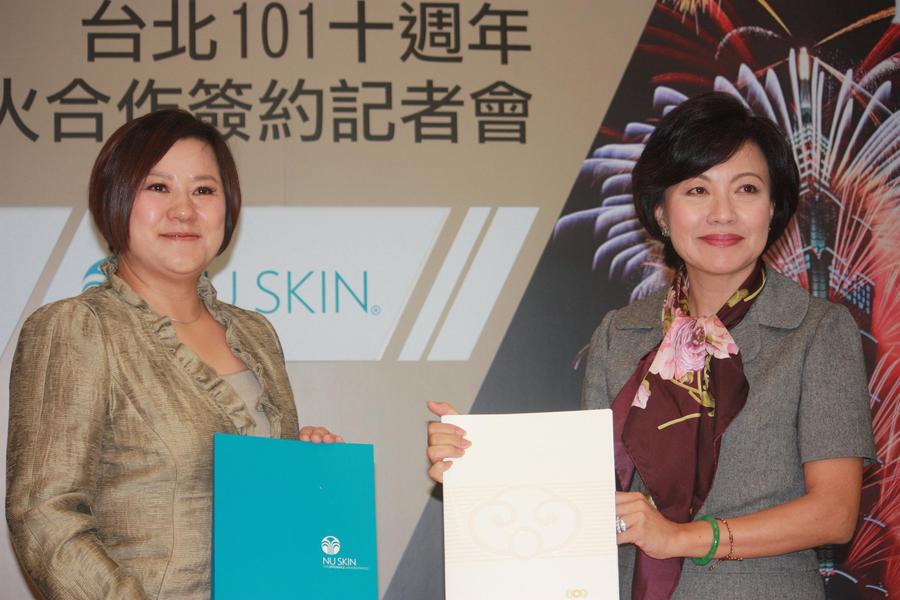 【台灣醒報記者方家敏台北報導】台北101十周年,跨年煙火秒數將再創新高!今年的101煙火將以「十」為主題,配上聲光效果,且比去年多了30秒,延長至218秒,將帶給民眾視覺與聽覺的饗宴。台北101董事長宋文琪與NU SKIN總裁姜惠琳4日進行101煙火秀簽約儀式,保證會帶給民眾一個前所未有的精采跨年煙火秀。