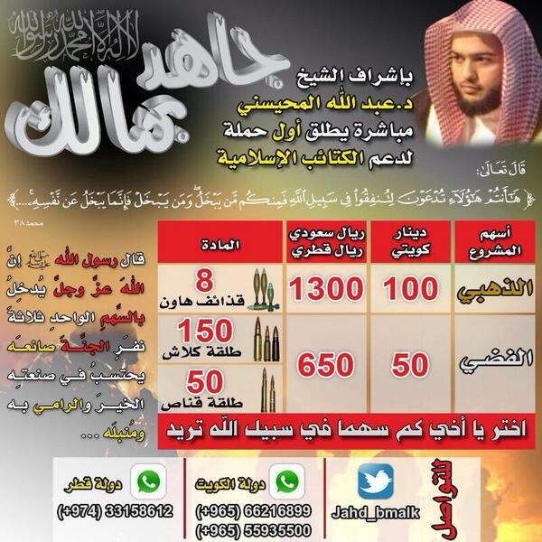 另一個敘利亞國內的募資者則是用推特發起的「給薪聖戰」活動,捐越多錢就會得到不同的等級。例如,捐助175美元讓聖戰士們買50顆狙擊槍子彈就能得到「銀等」;如果捐了16發迫擊砲的彈藥,就能得到「金等」。
