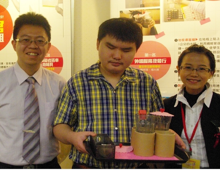 台北市啟明學校的陳明璐與楊大瑋老師說,啟明學校為了協助視障學生就業,在校開辦實習商店,然後在商店實習的第三年,全盲學生人數達75%,為了避免負責外場工作的學生相互碰撞,因而構想出「外場服務我最行」的發明,最後還得到「感官障礙組」第一名。