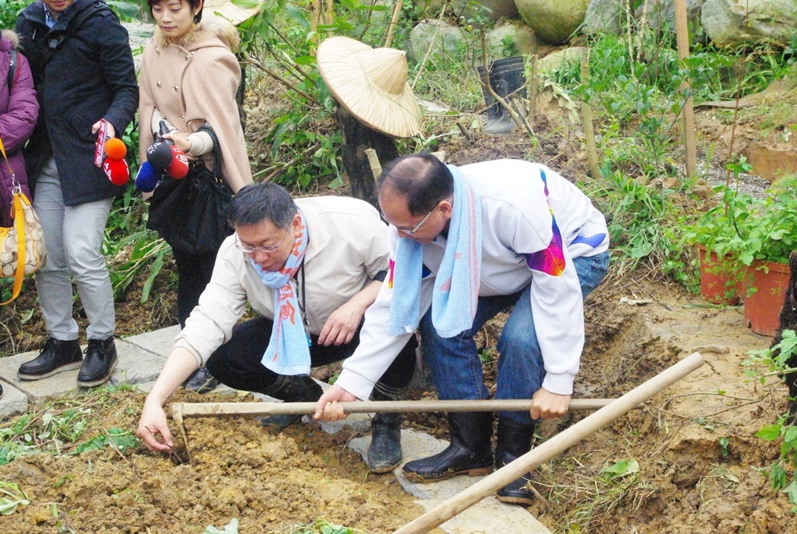 台大醫師柯文哲與前行政院長游錫堃,10日腳穿雨鞋、脖子上披著毛巾,選在信義區附近的山坡田地,拿起鋤頭作態種甘薯。柯文哲表示,是他主動向游錫堃請益宜蘭綠色經驗與有機農場,兩人對於選戰政策,都表示「明天再說」。目前民進黨台北市長候選人還未出線,游錫堃說,此次是柯文哲主動請益,不擔心被認為是選邊站。