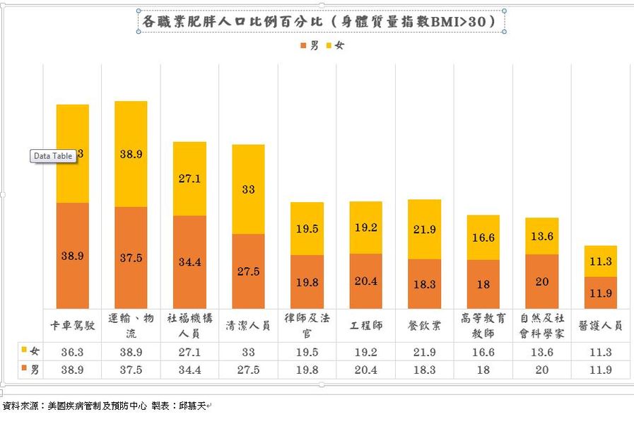 各職業肥胖人口比例百分比 美國疾病管制及預防中心調查發現,醫護人員肥胖比例最低,卡車駕駛肥胖比例最高。 相關新聞:職業影響 護士苗條、司機肥胖 http://anntw.com/articles/20140112-ngBT 捐款成為醒報天使 由於熱心人與支持者的捐款,醒報的深度報導與客觀評論都是免費閱讀的,希望你也能加入「醒報天使」的行列,小額支持。我們會寄給您抵稅收據! 相關新聞 AI讓經濟成長7.25%2026仍受關稅影響 《劉伯恩談減重》減肥會影響生理期及內分泌功能嗎? 藍委敏感時機赴中難逃抹紅影響觀感