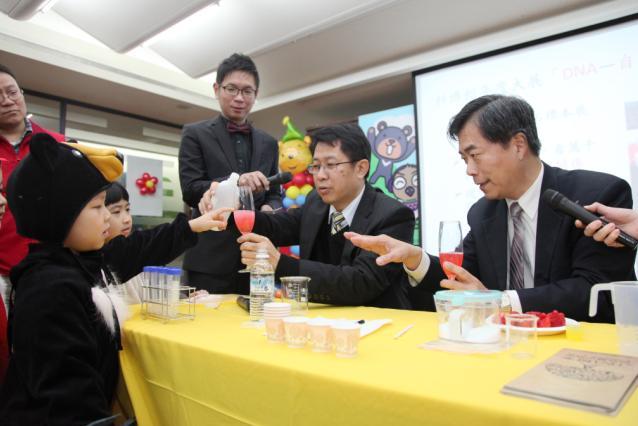 科博館館長孫維新在記者會中介紹科博館正在展出的《DNA檔案:自然歷史解密》特展,還帶著蔣偉寧動手做「萃取草莓DNA和口腔細胞DNA」科學實驗,一旁的小朋友看得目不轉睛,蔣偉寧一邊做實驗一邊跟小朋友談話,「小朋友學生物還可吃草莓喔!」最後,館長用筷子成功的將草莓DNA夾起來,大小朋友看了都驚呼神奇。