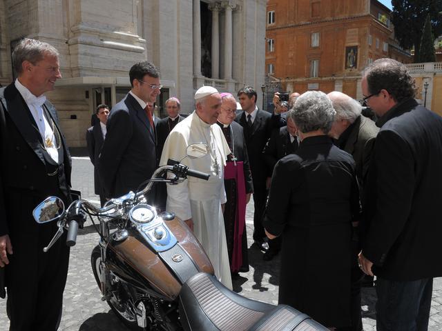 然而這些穿著皮衣的大漢,來到梵諦岡的聖保羅廣場外時,卻都靜了下來,與修女和其他數萬人一起參加教廷舉辦的彌撒與反墮胎集會。當教宗方濟在廣場巡行降福時,受到這群同為天主教徒的哈雷車迷簇擁,並代表車廠贈送他一輛哈雷旗下的經典款「動能超級滑翔」(Dyna Super Glide)以及皮衣。方濟當場在重機油箱以及皮衣上簽名以及合照,只是沒有騎上機車。
