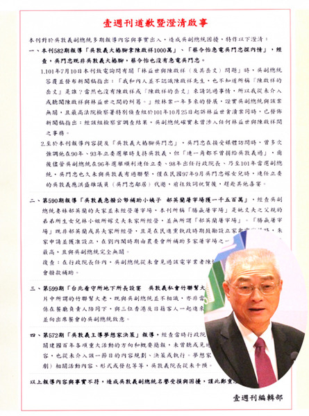 【台灣醒報記者方家敏綜合報導】吳敦義負面新聞風波事隔1年半,《壹週刊》以全版分4點致歉。第660期《壹週刊》針對副總統吳敦義從101年起的多篇報導刊登道歉啟事,經證實後確認為報導上的疏漏。針對「吳敦義大樁腳拿陳啟祥1000萬」、「蔡令怡急電吳門忠探內情」等多篇報導,吳敦義曾在101年一併提告,最近判決《壹週刊》敗訴,必須公開澄清。吳敦義15日也說,如今周刊登報道歉,真相大白,他如釋重負。
