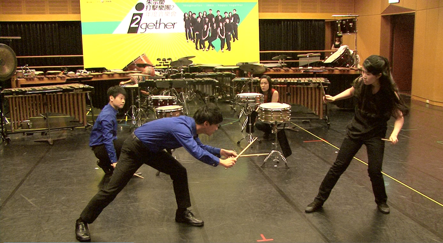 團員們又以11人制的隊伍,打著不同材質的樂器,詮釋美國知名搖滾樂鼓手萊利的作品《暴躁的眼睛》,演奏過程,揉合金屬與木質打擊樂器,加上人聲嘶吼,使在場觀眾不僅聽到打擊樂聲的氣勢,也能看到充滿戲劇效果的「音樂劇」演出。