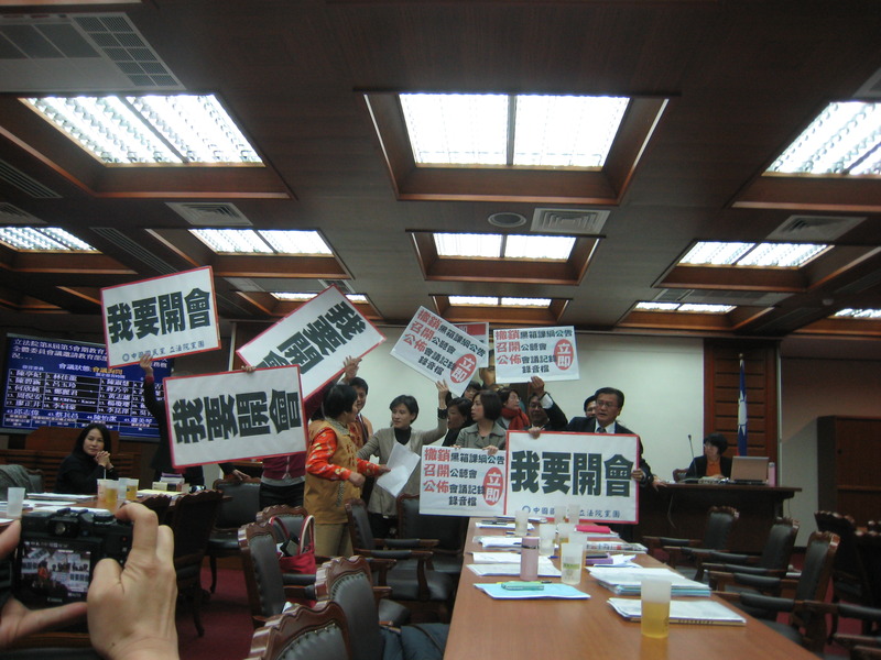 綠營立委則高舉「黑箱課綱」、「撤銷課綱公布」等立牌,揚言杯葛到底;無黨籍立委高金素梅則無奈地坐在台下。兩黨曾一度要協商溝通,最後因爭執不下,仍以散會終場。