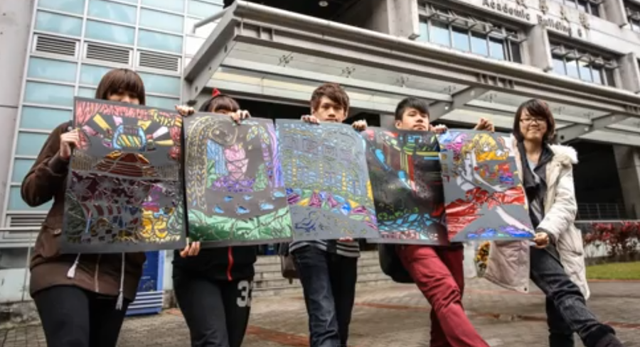 工設系一年級學生侯怡安說,同學們分成3組,一組10個人,分別在校內走一圈,觀察校園景色,先畫好草稿,再貼上美國黑卡紙與玻璃紙。她的作品描寫行政大樓的特色,學生情侶雙雙對對經過這裡,非常甜蜜。