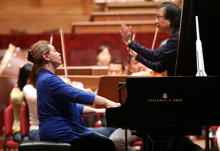 NSO總監呂紹嘉率領國家交響樂團與俄國鋼琴巨擘齊柏絲坦,共同進行排練,演奏拉赫瑪尼諾夫的作品《第四號鋼琴協奏曲》。(Photo by NSO)