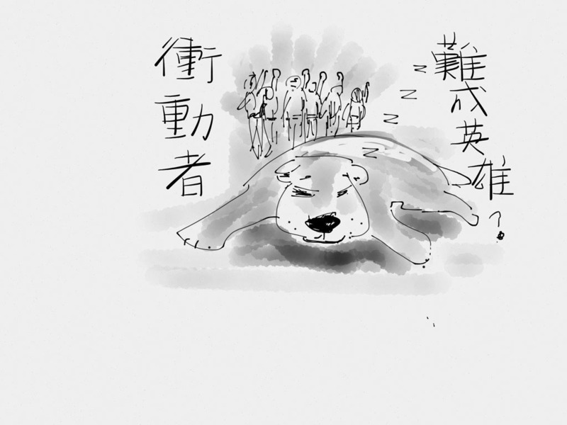 這黑影站起來高過百貨公司,走路搖擺笨重像熊,只有利牙的嘴巴發出沒人聽得見的吼聲,繞開公機關、商業區和豪宅,大口啃食那些有歷史的建築物。許多老房子天亮後就這樣化為瓦礫堆;住在裡頭的小老百姓、榮民和勞工都下落不明。