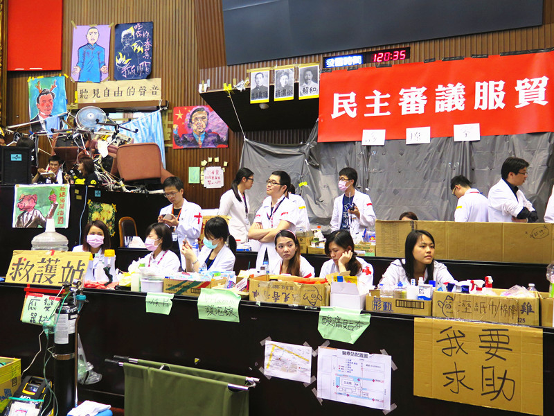緊跟著318青年佔領立院議場行動集結的醫療志工團,成立已近2週,全台參與的醫護人員已無從計數。總指揮指出,佔領議場3天後,面對警方攻堅壓力逐漸減輕,反而是拉傷、扭傷案例增加,但近日來嚴重傷患確實不多,唯一麻煩的是,每天至少有1至2人會因為癲癇或暈倒,必須出動擔架緊急送醫。