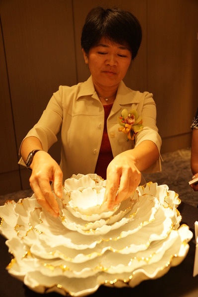 完全台灣設計、製造的「富貴牡丹盤」,是使用瓷材打造的,整個作品是由8件大小不一的牡丹花瓣堆疊而成,最大的直徑有40公分,最小的11公分,作品設計公司「1300」公司經理洪櫻真表示,每個人可以根據自己的需求,使用5個花瓣或3個花瓣,放置小花、小葉或是水果等,她強調,因為花瓣本身底色是白色,所以只要紅色、綠色、黃色的物件擺在其上都會非常好看。