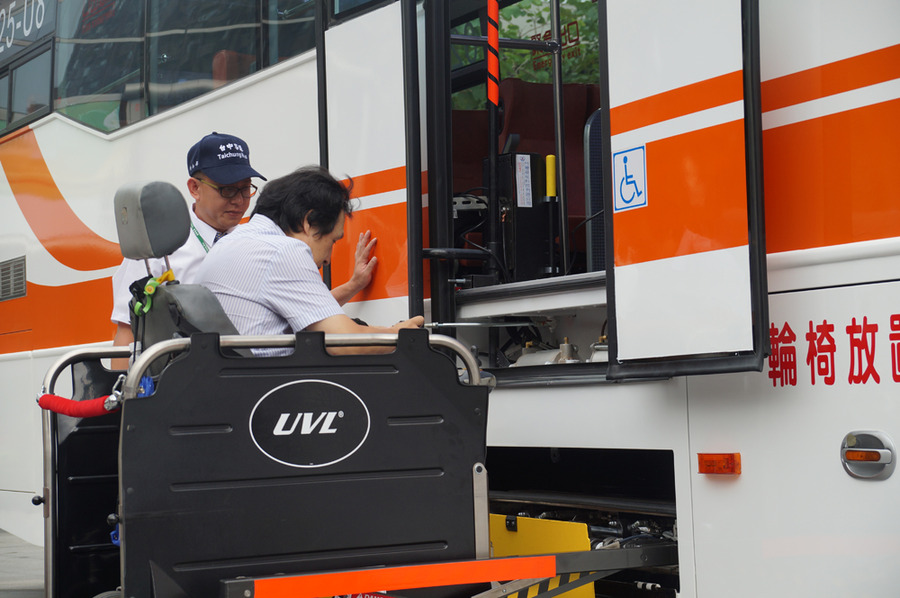 【台灣醒報記者徐欽盛台北報導】將輪椅推進大客車升降機,升高一米後即可直接進入車廂,從此肢障朋友乘車外出、旅遊不再辛苦了;交通部次長陳建宇26日在首航記者會上表示,交通部從100年就開始致力於推動無障礙乘車環境,這次與台中客運聯手推出全國第一輛通過安全檢驗的通用無障礙大客車,希望能對須搭乘無障礙運具外出的朋友帶來最大的方便。