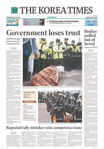 南韓客輪歲月號沉船事件震驚全國。20日早上,逾百名船難失蹤者及死者家屬嘗試闖入青瓦台,向總統朴槿惠抗議政府搜救行動不力及未能掌握狀況,遭350名警力攔下,總理鄭烘原2次會晤家屬,試圖平息眾怒,但民眾不買帳,只是坐在警察陣前。