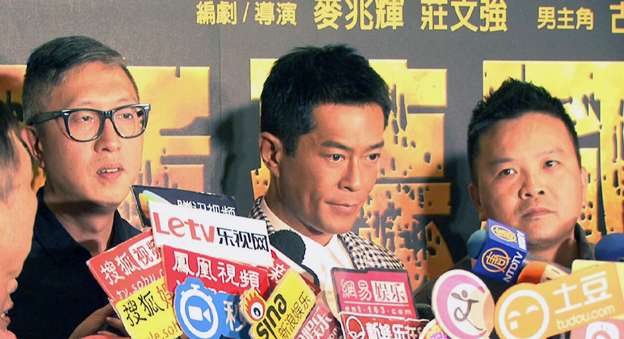 10日下午,港星古天樂維持一貫黝黑的膚色,搭配白色西裝,為《竊聽風雲3》站台,導演麥兆輝與莊文強也一併出席。(photo by 杜胤廣/台灣醒報)