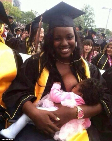 《每日郵報》報導,一名加州長灘州立大學的25歲女大生卡麗莎於畢業當天帶著3個月大的女兒出席畢業典禮,並在典禮上為肚子餓而哭鬧的女兒哺乳,大方讓朋友拍照。有不少網友鼓勵她公開哺乳的行為,認為能夠以自然的方式餵飽自己的孩子是值得驕傲的事;但也有人認為,在公開場合袒胸露乳非常不適切,至少應該蓋住胸部。