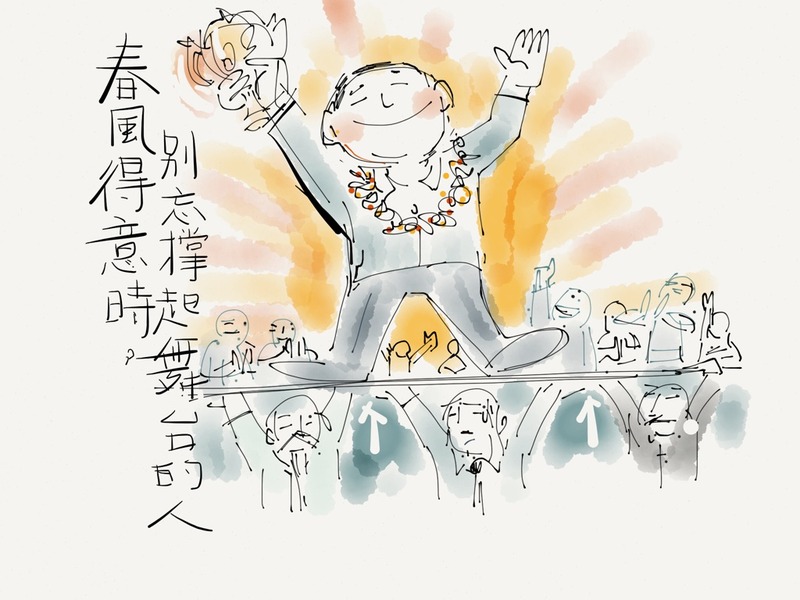 丙:忘記了。當初不是說要將就職典禮搞得超大,特別找了幾百個人疊羅漢,要把新總統撐到半空中去,說是「平地起高樓」。