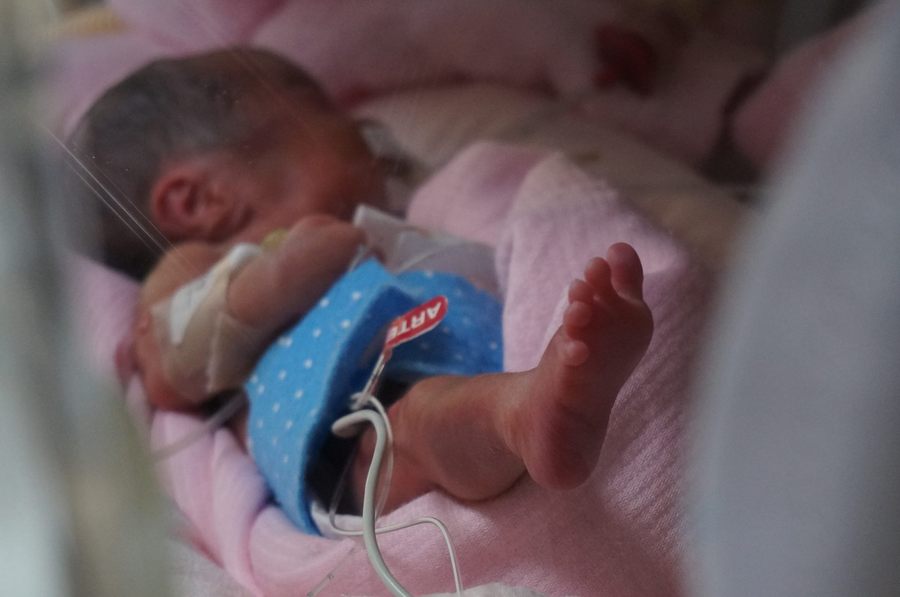 未料,不到25 週時,三胞胎其中的同卵雙胞胎發生輸血症候群,醫生無法採取任何急救措施,擔心動了胎氣,三胞胎都沒了,只能禱告求上帝保守,儘量撐到第28 週,寶寶肺臟發育完成、體重達900g,能保住一個算一個。