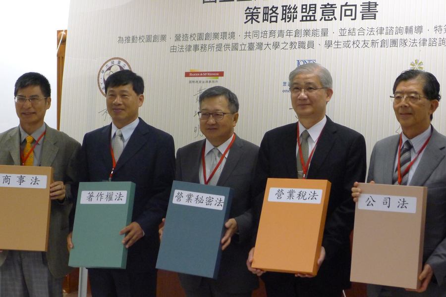 繼與4大會計師事務所舉行簽訂策略聯盟後,26日台大與國際通商法律事務所、萬國法律事務所、眾達法律事務所和寰瀛法律事務所舉行簽約儀式,楊泮池表示,盼望為學生打造的環境,能帶動台大與台灣整體的創新創業風氣。