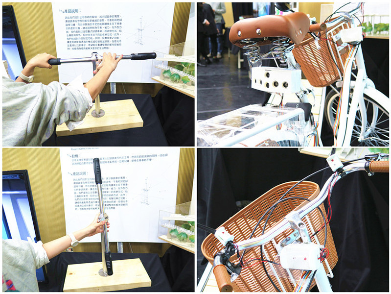 另1組改造自行車的團隊,考量聽障者騎車時聽不到後方來車按喇叭,非常危險,即便裝上後照鏡,視覺仍有死角,因此以感應器搭配警示燈,提醒聽障者後方來車靠近。負責設計的黃同學等人,在單車座椅下方安裝感應器,只要感應到後方有物體接近,龍頭上左、中、右3組LED警示燈就會分別開始閃爍;來車距離7公尺以內會閃黃燈,4公尺以內則會閃紅燈。