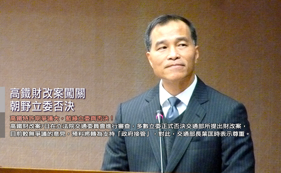 【台灣醒報記者鍾旭昶台北報導】高鐵特許期爭議大,藍綠立委齊否決!高鐵財改案7日在立法院交通委員會進行審查,遭以立委以0比18的的票數正式否決交通部所提出財改案,立委李鴻鈞提出先倒閉再接管,是目前較無爭議的意見,預料將轉為支持「政府接管」。對此,交通部長葉匡時表示尊重。