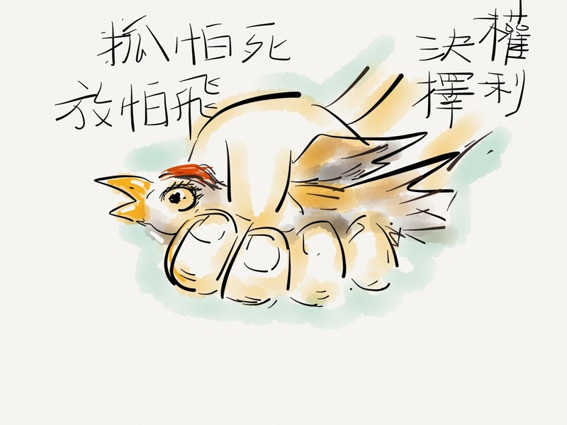 開始時他不大願意講,只是打哈哈,後來我塞張鈔票「孝敬他」,再三慫恿,他才說出自己根本沒練過太極,哪懂得鳥不飛。但他可以像杜立德那樣跟動物交談,甚而催眠牠們。他說自己每天做的事,就是跟麻雀們講「這裡有好吃的」,哄牠們下來後再施加暗示:你們是不自由的,天生就不會飛,永遠只能在我掌心裡擠,走不掉。他盯著我說:麻雀因此餓死也無妨,總有下一批會再來。