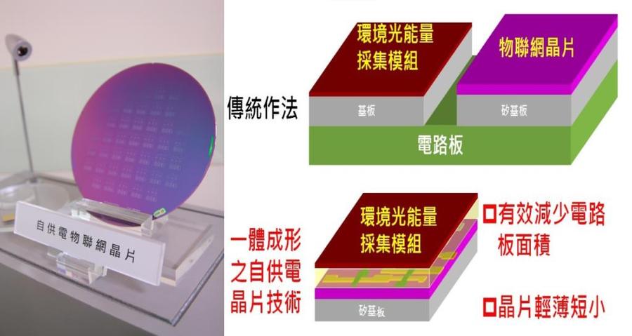 奈米元件實驗室以薄膜太陽能技術做發想,開發出的「一體成形環境光能自供電整合技術」。奈米元件實驗室研究員沈昌宏說,此3D積層式製程技術不但可以有效減少電路板面積,亦可大幅縮短電流傳輸距離,減少耗能提高物聯網晶片的實用性。他表示,以此種製程整合後,除了能減少晶片面積外,體積也會減少近千倍,有助於晶片普及化。