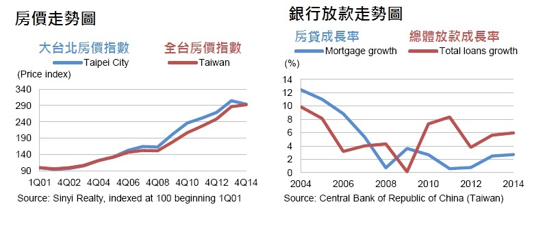 惠譽信評8日發布研究報告指出,台灣的金融機構房貸放款在2010年後已經走緩,每年大概成長率在2%上下,低於總體銀行放款成長率,而台北市至今年2月止的房價也比去年同期緩跌3.6%。