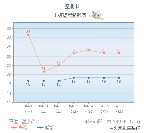 接著週三至週六,受東北季風影響,北部及花東地區仍偏涼,高溫約26度,中南部地區約28度。降雨方面,迎風面的北部和東半部地區及中南部山區有局部短暫雨,但雨勢會隨時間慢慢緩和下來。