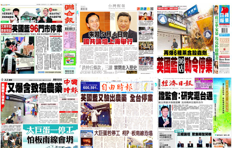 【台灣醒報記者張禹宣報導】知名飲品店英國藍又驗出農藥,全台停業,成為《中國時報》、《聯合報》、《蘋果日報》、《自由時報》22日頭版頭條。《中國時報》頭版頭條報導,「英國藍」玫瑰茶於14日被驗出含DDT後,21日又發現有6款茶飲的原料驗出致癌農藥「芬普尼」。