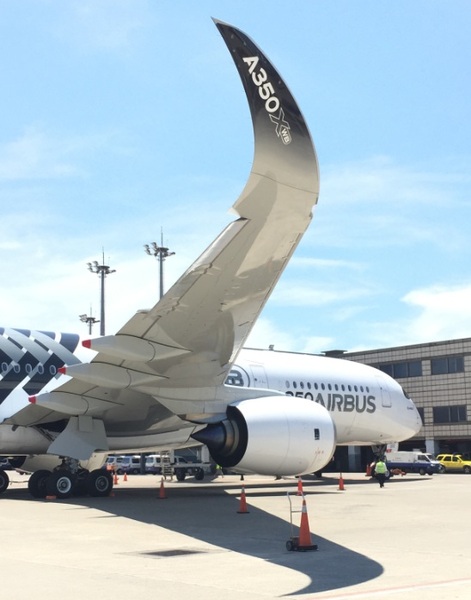 桃園機場16日中午降落一台空中嬌客,雪白的前半段機身搭配後現代風格的灰黑色X紋路機尾,強調它的碳纖材質,這是空中巴士最新中長程客機A350-XWB900機型,再搭配機翼尖有象鐮刀一般的導流小翼,乾淨俐落的左右兩邊各一組勞斯萊斯引擎,當如此酷炫的外觀的A350滑進停機坪時,引起現場一陣騷動。