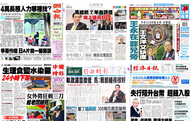 《台灣醒報》頭版頭條報導,總統馬英九在就職7週年記者會上表示,自己對得起人民,晚上睡得很安穩。針對還剩下一年的任期馬英九說,「我一定會完成還沒有完成的事情。」《自由時報》頭版頭條則強調,18日公布最新民調也顯示,馬總統執政7年的施政滿意度為14.51%,不滿意度高達64.37%,民進黨批馬執政失敗,對民眾吃不好、睡不穩無感。