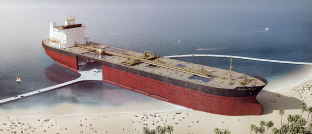 石油是當今全球不可或缺的能源,而猶如摩天輪大小的油輪則為石油的重要運輸方式,然而當油輪年限到須報廢以後,卻往往只能躺在發展中國家的船隻墓地,由貧窮工人徒手處理這些沾滿有毒化學品和剩餘油漬的廢鐵外殼,以換取微薄利潤。據科技新聞網站《Gizmodo》報導,Chris Collaris將利用油輪龐大而平穩的特性,將其重建為近沙灘的海上公共建築。
