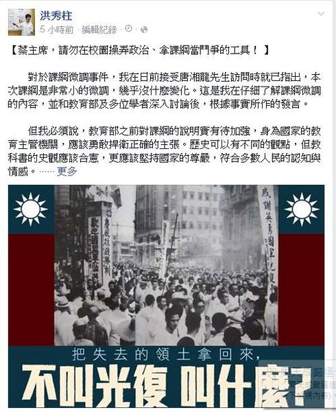「民進黨主席蔡英文有義務在鼓動高中學生上街頭前,向社會解釋說明『微調課綱』的真相。」洪秀柱強調,「年輕人關心公共議題、參加社會運動,本是好事,但請勿把政治的意識形態之爭染指到教育場域,把學子充當政治表演的道具。」洪秀柱痛斥,蔡對課綱微調一再「加碼演出」,已經「觸犯到我的逆鱗」。
