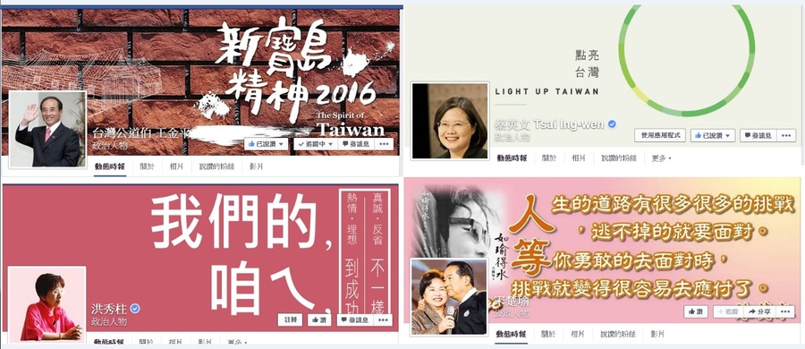 立法院長王金平就成立臉書「台灣公道伯」互動強,幾乎每一則網民留言,管理員都會以「公道伯」身分回應;國民黨總統參選人洪秀柱與蔡英文的臉書上是大量的掃街、拜訪民間照片,親民黨主席宋楚瑜臉書則較念舊,最近放的都是夫人陳萬水的紀念文章。
