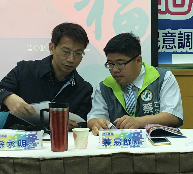 時代力量近日頻頻呼籲,希望民進黨在多數席次的情況下,能與之交換一席交通委員會席次,目前已確定被拒絕,讓外界猜疑可能影響兩黨感情,蔡易餘與徐永明24日意外在「數位匯流調查」記者會碰頭,2人相鄰而坐,屢次交頭接耳,顯見交涉雖然破局,但並不影響彼此感情。