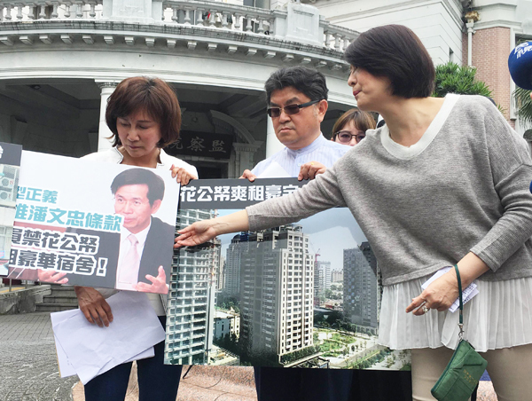 【台灣醒報記者鄭羿菲台北報導】行政院長林全內閣的教育部長被檢舉了!國民黨文傳會副主委王鴻薇25日陪同台中市議員黃馨慧及李中,到監察院檢舉教育部長潘文忠任職台中市副市長時,放著公有宿舍不住,卻由市府每個月花公帑約3萬租豪宅。黃馨慧表示,市府違法挪用「辦公廳舍租賃」項目支付租金。監察院已受理檢舉。