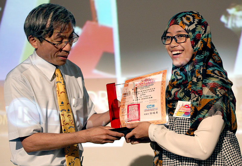 印尼留學生Andry(右)以《離家千里 驚艷高雄》獲得報導組第一名,她領獎時難掩興奮心情。(photo by 盧明正/台灣醒報)