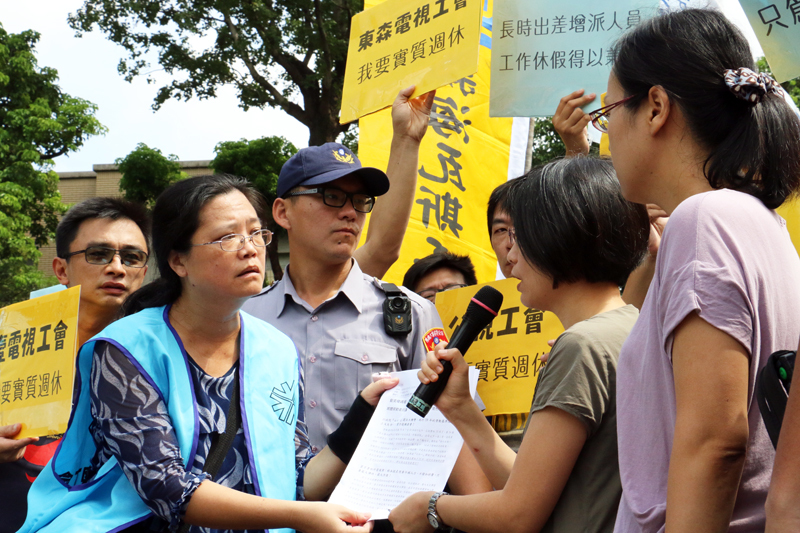 【台灣醒報記者戴昱愷台北報導】「我要實質周休,不要變形工時!」台北市產業總工會總幹事陳淑綸帶領現場的媒體工會代表向政府齊聲吶喊。台北市產業總工會聯合16家媒體工會,2日在行政院大門前抗議、批評七休一政策如髮夾彎一轉再轉。行政院內政衛服勞動處參議吳婉慧接受陳情書時,表示政府會再討論、協商。